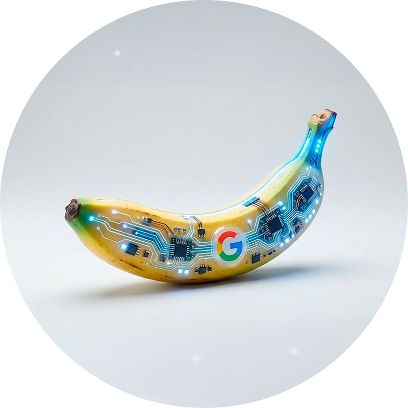 Banana estilizada com circuitos eletrônicos luminosos e o logo do Google ao centro, sobre fundo claro minimalista.
