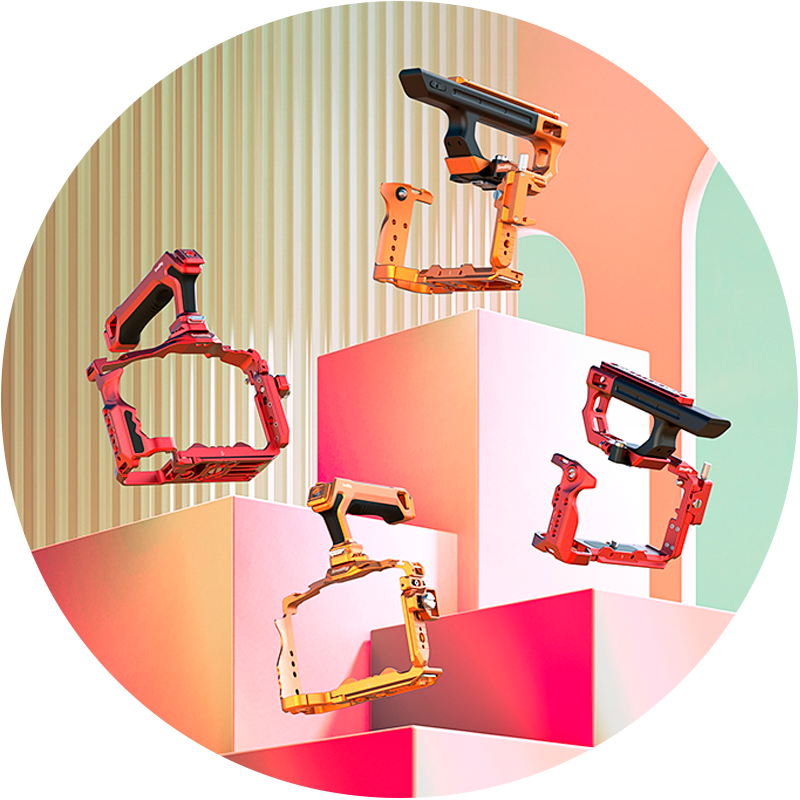 Rigs de câmera em tons de vermelho e laranja exibidos sobre blocos geométricos em cenário moderno e colorido.MONTAGEM DE ACESSÓRIOS E VERSATILIDADE