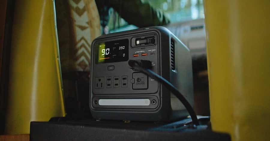 Estação de energia portátil conectada a um cabo de alimentação, com tela digital indicando nível de bateria, posicionada em ambiente interno ao lado de objetos domésticos.