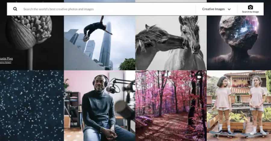 Tela de banco de imagens com galeria de fotos criativas, incluindo pessoas, natureza e cenas artísticas